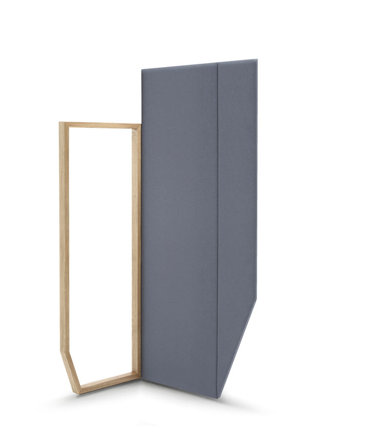 Screen, frame in natural varnished solid oak. Panel in MDF, covered in Divina acier.